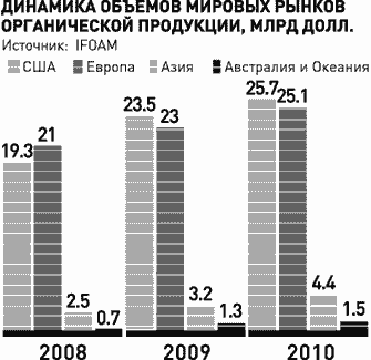 - Оборот мирового рынка экопродуктов составляет примерно 60 млрд долларов. Причем он стремительно растет - примерно на 30% в год. Россия, по мнению специалистов, отстает от мира в сфере экопродукции лет на 15-20. По данным International Federation of Organic Agriculture Movements (IFOAM), объем российского рынка экопродуктов составляет 60-80 млн долларов, это 0,1% от всех продуктов питания. На сегодняшний день большая часть экопродукции, к сожалению, это импорт.