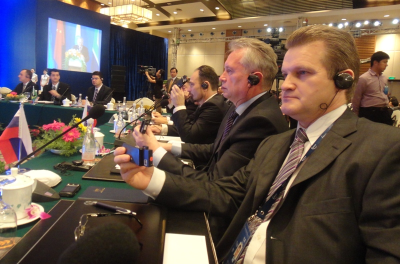 Мы привыкли к тому, что обычно в центре зала при проведении подобных конференций устанавливается "круглый стол". Здесь же сразу бросается в глаза, что стол, покрытый синим сукном, имеет другую форму периметра - в виде полого пятиугольника. Делегация каждой страны получает по одной из пяти сторон. Российской делегации достался правый центр, справа от нас разместились делегация Бразилии и Китая, слева Индии и ЮАР. Таким образом, за этим столом лицом к лицу оказались все участники, выступающие на форуме. Внутри пятиугольника по всему периметру ниже уровня столов были установлены большие мониторы, позволяющие каждому наблюдать за потоком текстовых, видео и фото- материалов. Система приема синхронного перевода была выдана всем участникам еще на входе в конференц-зал. Сами же переводчики находились в стеклянных кабинах, так что их было не только слышно, но и видно.